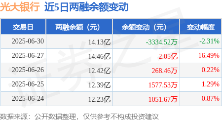 本站消息,6月30日,光大银行(601818)融资买入8123.7万元,融资偿还1.16亿元,融资净卖出3484.67万元,融资余额14.03亿元,近20个交易日中有11个交易日出现融资净买入。