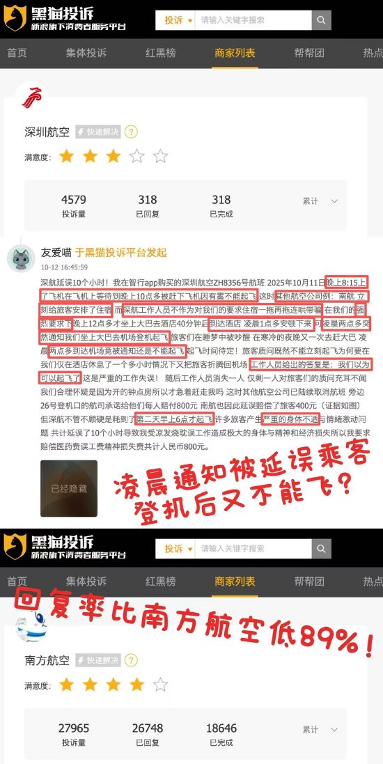 近期,有消费者向黑猫投诉 【下载黑猫投诉客户端】反馈,自己乘坐深圳航空航班晚上8点多上了飞机10点多又被赶下来不能起飞,在别的航司立刻给安排住宿的情况下,深航一拖再拖在乘客强烈要求下才安排酒店休息。凌晨一点多到达酒店,凌晨两点多又被通知上大巴去机场登机起飞,到达后又被通知不能起飞。面对乘客质疑航司仅回复称以为可以起飞了。最终第二天早上才起飞,航班共延误10个多小时,来回折腾乘客造成严重身体不适却无任何补偿。截至目前,深圳航空在黑猫投诉平台投诉累计达4579单,回复率仅为6.94%,比南方航空低89%。